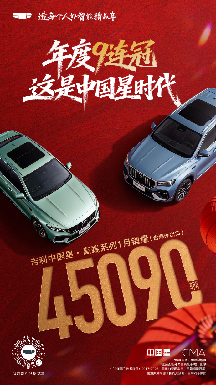 В январе продажи премиальной серии Geely China Star достигли 45 090 единиц, завоевав доверие более 1,78 миллиона пользователей благодаря высочайшему уровню производительности.