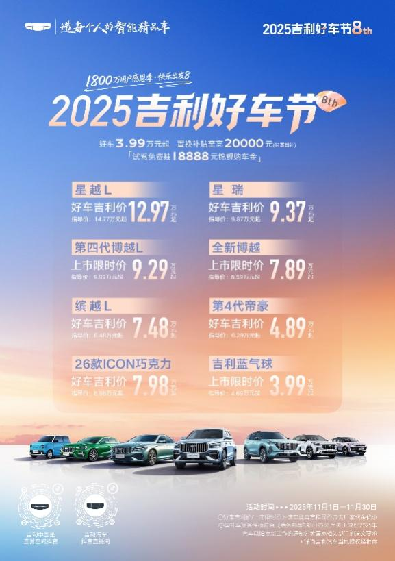 С 1 по 30 ноября официально стартовал 8-й ежегодный фестиваль Geely Good Car Festival 2025 под девизом «Благодарим 18 миллионов пользователей». Будучи крупнейшим в конце года мероприятием Geely Auto, посвященным покупке автомобилей, в этом году оно продолжает следовать основным принципам «Хорошее качество, хорошая цена и выгодные предложения», представляя целую гамму основных бензиновых моделей, включая China Star, Bo Series, Bin Series и Luxury Series. Благодаря сверхнизким ценам, многочисленным субсидиям, преимуществам платформы и офлайн-празднованиям, мероприятие предоставляет потребителям по всей стране комплексное и выгодное приобретение автомобилей, выражая благодарность миллионам пользователей за их доверие и поддержку на протяжении многих лет, предлагая ощутимые скидки и услуги.