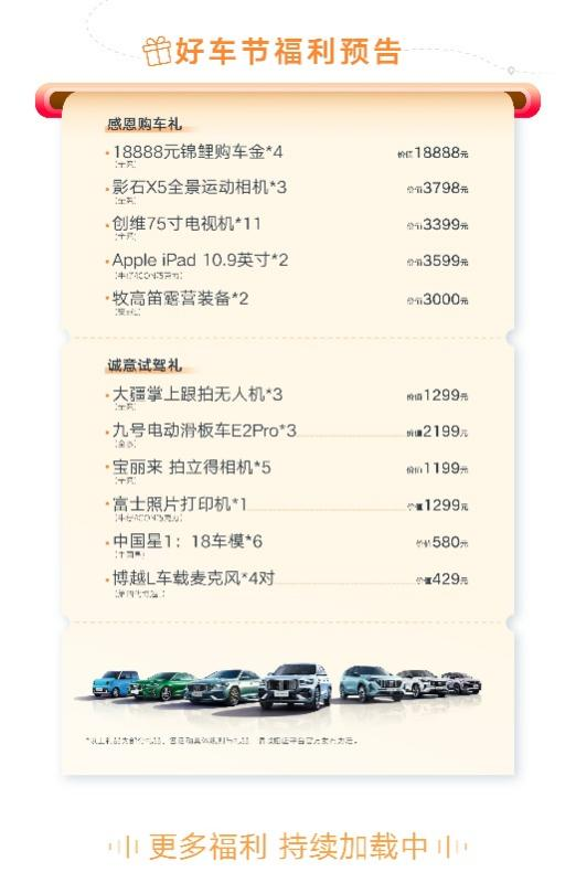 Воспользовавшись сезоном благодарности, охватившим 18 миллионов клиентов, Geely Auto одновременно запускает серию дополнительных мероприятий, включая акцию «Geely China Warm Winter» в конце года, осеннее послепродажное обслуживание и накопление баллов Geely за публикацию положительных отзывов, предоставляя обратную связь клиентам на протяжении всего цикла покупки и владения автомобилем. Потребители могут следить за обновлениями акции в режиме реального времени через официальный аккаунт Geely Auto в WeChat, аккаунт Douyin и другие официальные каналы, чтобы получить доступ к ещё более эксклюзивным преимуществам.