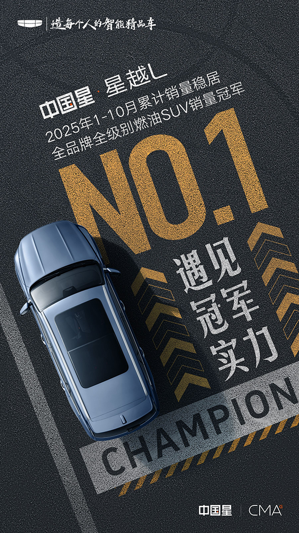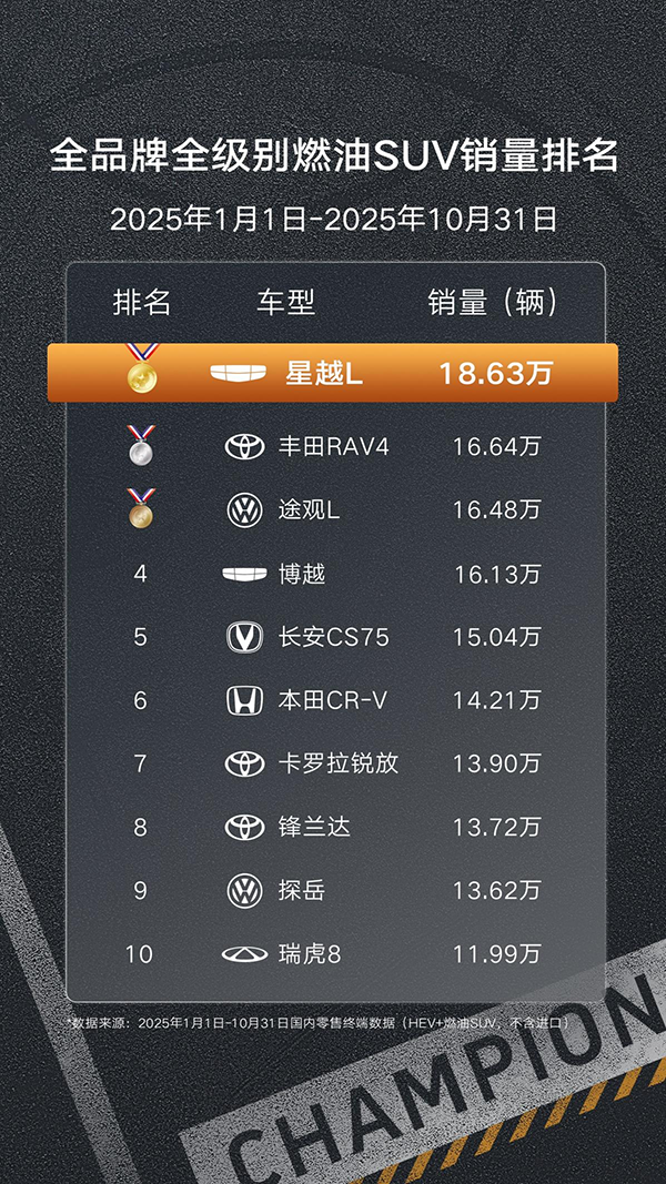 Geely Xingyue L сохранил позицию самого продаваемого бензинового внедорожника среди всех марок и сегментов с января по октябрь 2025 года.